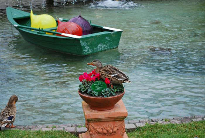 池で飼っている鴨にむしゃむしゃと花を食べられるシクラメン。