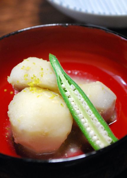 旧家に代々伝わる漆器に八幡芋の味噌煮。