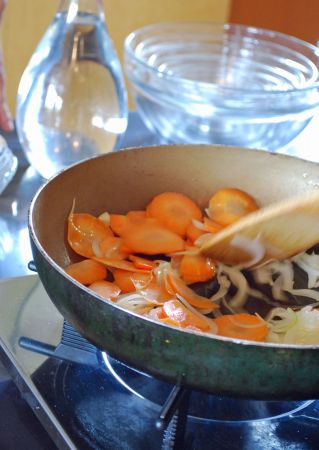 玉ねぎと人参のスライスを炒める。
