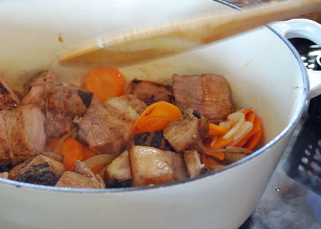 そこに豚肉、ワインベーコンを投入。