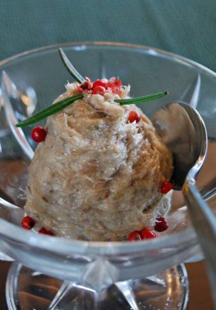 赤い胡椒とローズマリーをあしらった豚肉のリエット。