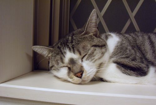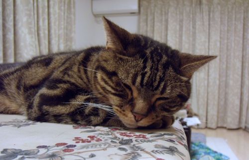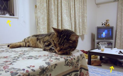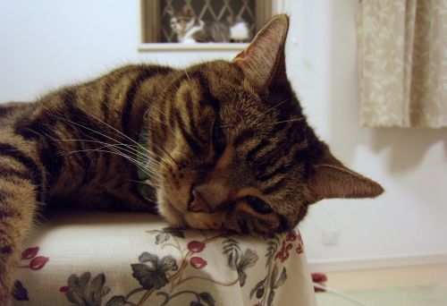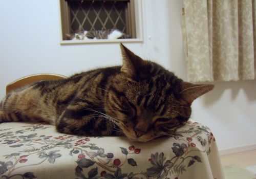 テーブルの上の猫も自分の手を枕にうとうと・・・。