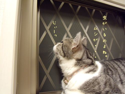 窓には外にいる何かを目を剥いて凝視する猫がいて