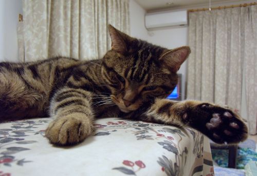 なにやら、枕にしていた手を伸ばしてみたりする猫がいて