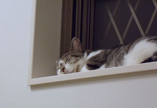 窓で外を見ていた猫が飽きて、自分の手を枕に眠り始める。