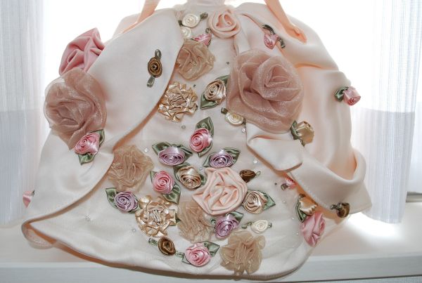 色とりどりの、素材も大きさも違うバラを縫い付けてある豪華なドレス。