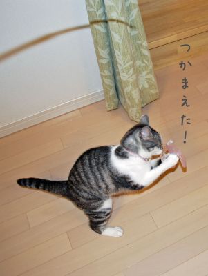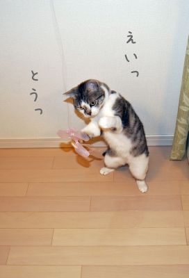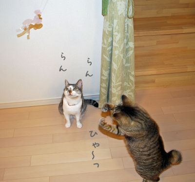 フェイクやんまに狂喜乱舞して、連続ジャンプを見せる猫たち。
