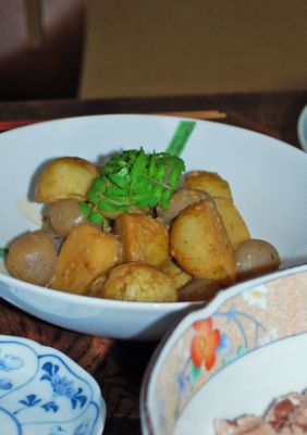 新じゃがと蒟蒻の煮付け味噌風味