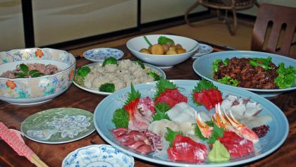 鶏のモツ(これは買ったもの)と夫のためにたっぷりの刺身も。