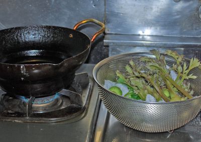 揚げたてのタラの芽と独活(の葉っぱ)、自家製アスパラの天ぷら。