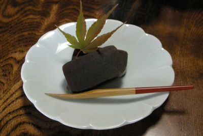 (たぶん)虎屋の羊羹。 添えられた微妙な色あいの椛は、もちろん庭のもの。