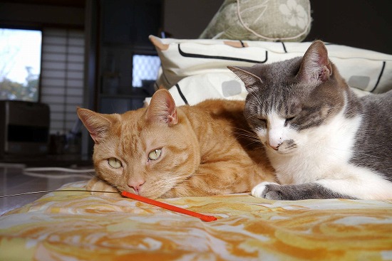 心配そうな風猫と喜ぶメイ。
