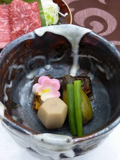 炊合せは岩魚、里芋、インゲン、茄子、生麩。