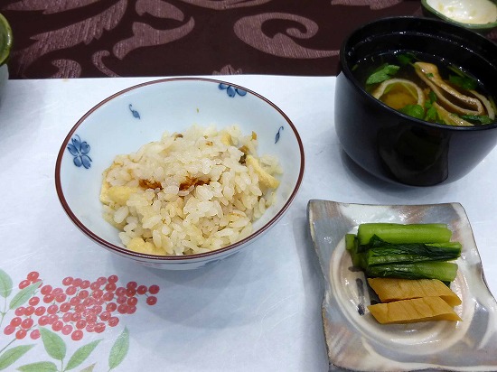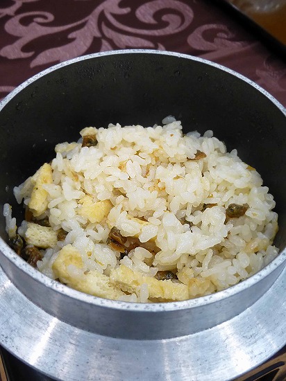 うす揚げ入りの安曇野米のご飯はお焦げも香ばしい。