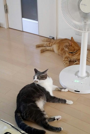 猫は扇風機の周りに集まり、暑さをしのいでいる。