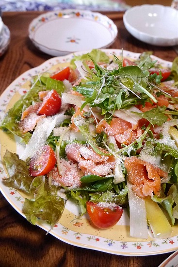 ベビーリーフ、独活のスライス、ミニトマト、スモークサーモン