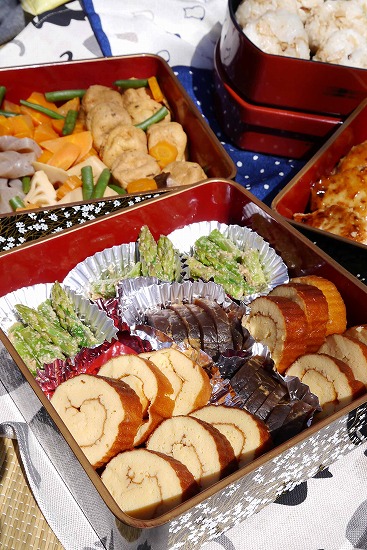 ニの重は伊達巻、アスパラ胡麻和え、奈良漬。