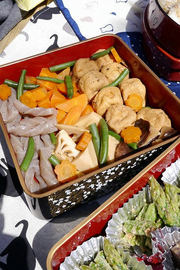 三の重は飛竜頭、にんじん、筍、こんにゃくの煮染め。