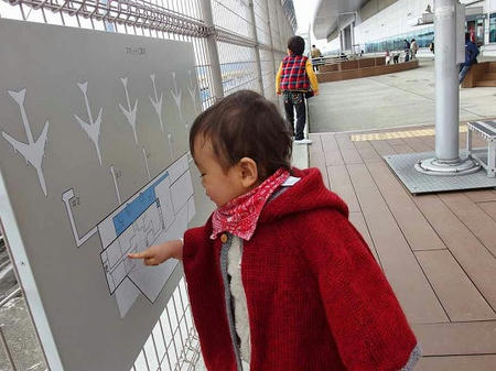 空港で飛行機(の看板)を見るユヅルとカオル。
