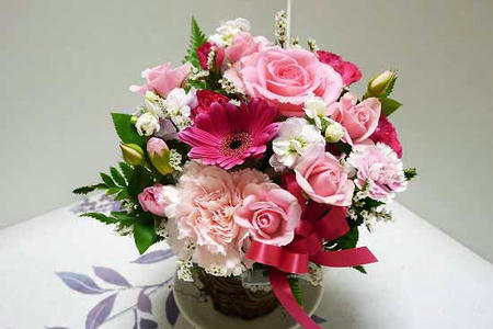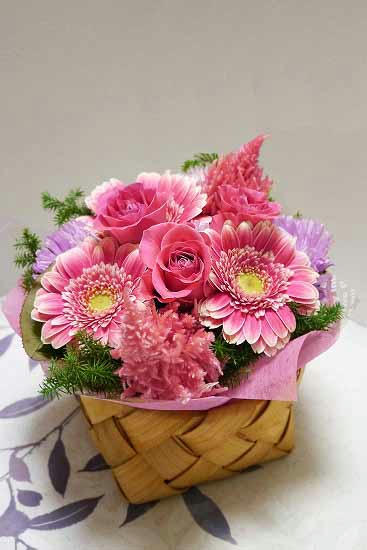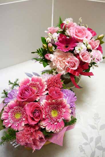 やはりフクシアのガーベラ、ピンクのバラとカーネーション、スターチス