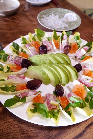 これを皿に交互にぐるりと並べ、真ん中にアボカド。