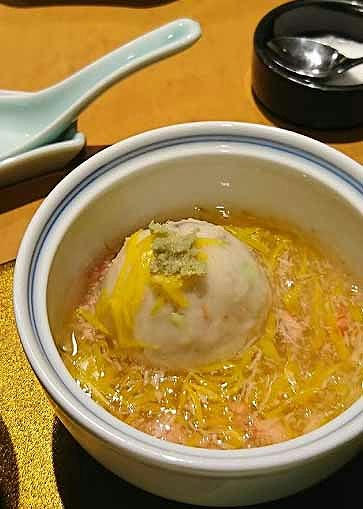 葛餡には黄菊、柚のせんぎり、蟹、山葵。