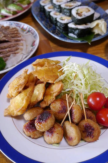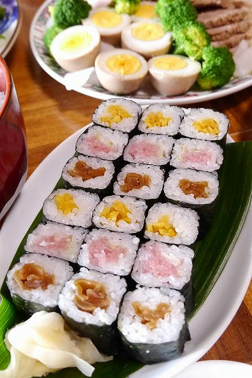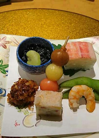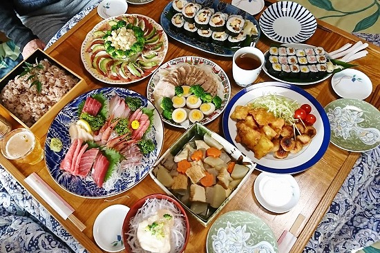 くるみの鰹節和え、吹き寄せ、寿司、もずくなどが