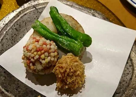 色とりどりのあられ、湯葉などをまとってほっくりと。