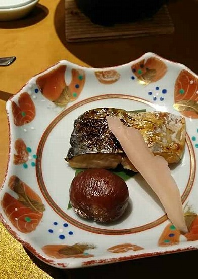 添え物は栗の渋皮煮と生姜の甘酢漬け。
