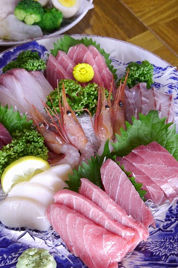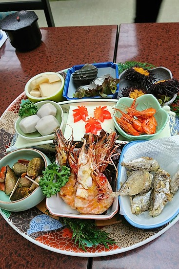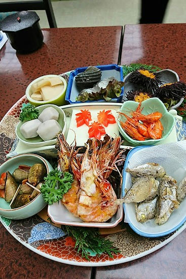 ウニの殻焼き、有頭エビ、川エビ、サザエ