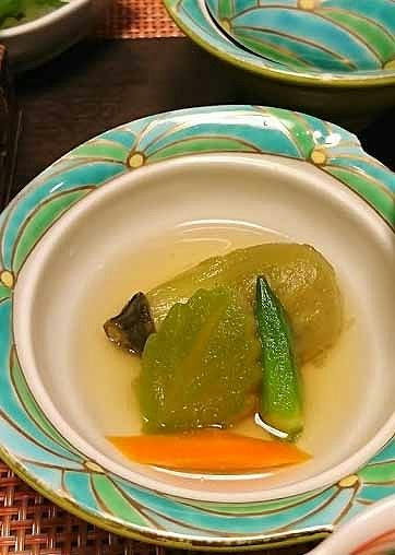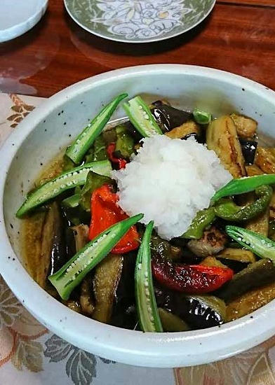 この家のナスとオクラ、ピーマンの揚げ出し風。