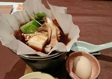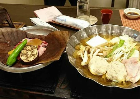 地元の伊達鶏と野菜の鍋、牛の朴葉焼き。