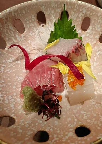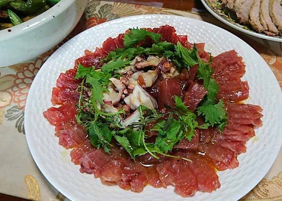 マグロとタコのカルパッチョ風 柚醤油風味。